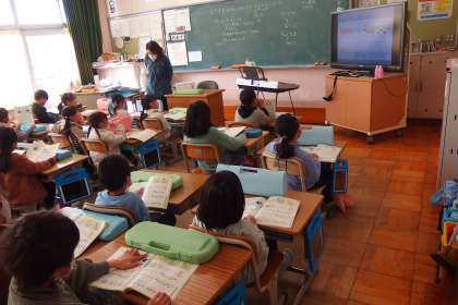 1年生の音楽の授業です。 スクリーンに映っているのはデジタル教科書です。