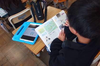4年生の社会の授業です。 資料をタブレットで参照しています。
