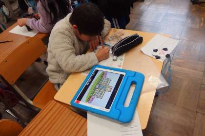 6年生を送る会に向けて準備をしています。 イラストを描くのにタブレット調べた画像を参考にしています。