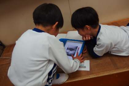 6年生を送る会に向けて準備をしています。 イラストを描くのにタブレット調べた画像を参考にしています。