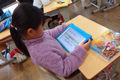 3年生の社会の授業です。 副読本「とよた」を学習用タブレットで読んで勉強しています。