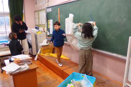 朝の歌の歌詞を協力して黒板に貼り出していました。