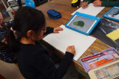 3年生の図工の授業です。 下書きのデザインアイデアをタブレットで検索しながら進めています。