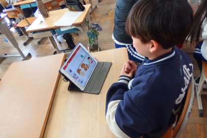 タブレットを囲んでなにやら相談中の5年生です。