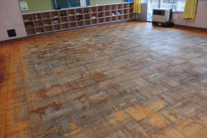 下の写真は、子どもたちの下校後に先生たちがワックスがけをしてテカテカになった教室です。