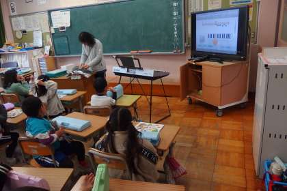 3月11日の東広瀬小学校 公開日 2025/03/15 更新日 2025/03/15 活動の様子 1年生の音楽の授業です。 スクリーンに映っているのはデジタル教科書です。 タブレットからメロディを流しています。