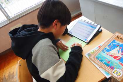 タブレットをサポートに使いつつ、英語で手紙を書いています。