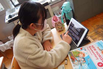 5年生の英語の授業です。 タブレットをサポートに使いつつ、英語で手紙を書いています。