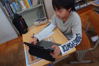 5年生の英語の授業です。 タブレットをサポートに使いつつ、英語で手紙を書いています。