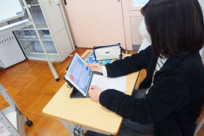 5年生の英語の授業です。 タブレットをサポートに使いつつ、英語で手紙を書いています。