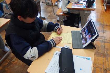 タブレットをサポートに使いつつ、英語で手紙を書いています。
