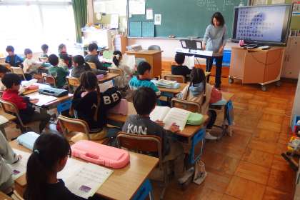 1年生の音楽の授業です。 タブレットから歌詞をスクリーンに映し、メロディを流しています。