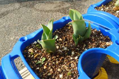 1年生が秋に植えたチューリップが大きく葉を広げています。 あと1週間ほどで開花でしょうか。