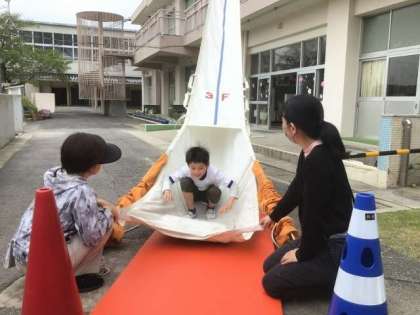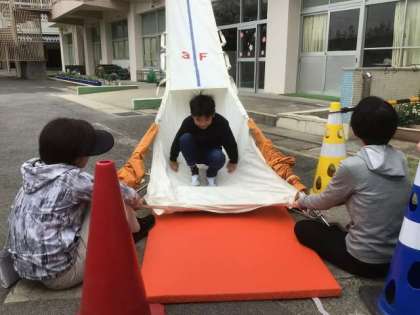 3年生と4年生は、3階の教室から救助袋を使って避難する体験をしました。