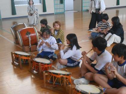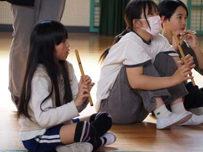 東広瀬小学校のクラブ活動は、地域の方を講師に迎え、行っています。伝統芸工クラブは、水神ばやしの笛や太鼓に挑戦です。動画を見た後、実際に自分たちでやってみると、竹笛は息の吹込み方が難しく、簡単には音が出ません。これから少しずつ音が出るようになっていく過程で、「難しいけどやってみよう!」「ちょっとできた!」という思いをを子どもたちに味わってもらいたいと思っています。
