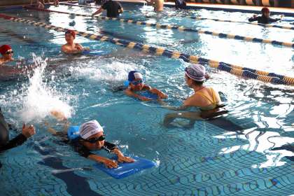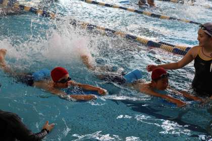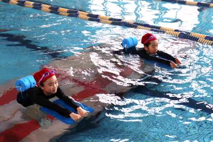 ビート板を使って、バタ足で泳ぎました。足首やひざをうまく使うことで進む力が生まれます。
