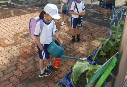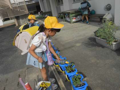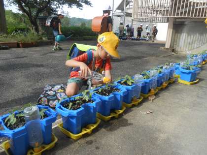 生活科の学習として、1年生はアサガオを、2年生は夏野菜を育てています。「早く大きくなあれ」との願いを込めて、水やりをする1・2年生です。2年生は、ミニトマト・ナス・キュウリの中から自分で育てたいものを選んで、育てています。