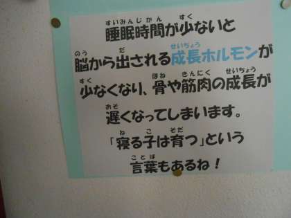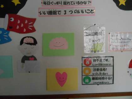 健康に関する掲示が保健室の前にあります。養護教諭の先生が、子どもたちがつい立ち止まって見てしまう掲示を工夫しています。今回は、「ぐっすり眠れているかな?」「いい睡眠で3つのいいこと」です。