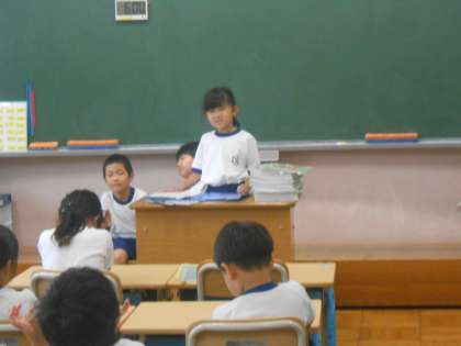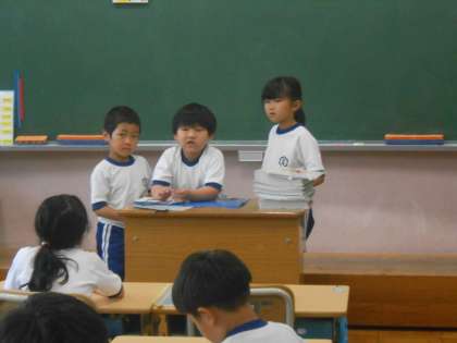 1年生の朝の会の様子です。健康観察では、係の子が前でひとりずつ名前を呼びます。聞き取りやすい、大きくてはっきりとした声でした。