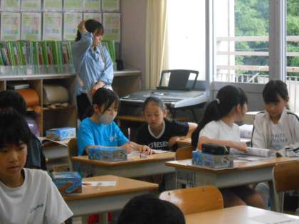 上:4年生は理科「電池のはたらき」。友達と相談したり教科書で今までの学習を思い出したりしながら、自分の考えを整理しているところです。