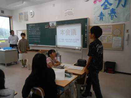 下:6年生は社会科「法律を制定してみよう」。こんな法律があったらいいなとグループで考えた案を提案し、質疑応答をしているところです。