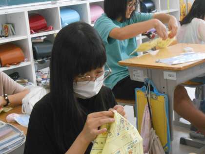 5年家庭科 公開日 2025/09/15 更新日 2025/09/15 活動の様子 返し縫いだけでなく、針に糸を通すのも慣れない作業です。 糸通しを使ったり、何度もやりなおしたりしながら、がんばっていました。