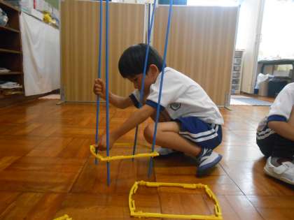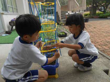 2年生は夏野菜を育てています。この日は、支柱を自分で組み立てて、自分の植木鉢に取り付けていました。難しいところは先生や友達と一緒に協力していました。「ぼくはミニトマトを育てているんだよ」と教えてくれ、収穫を待ちわびる思いが伝わってきました。