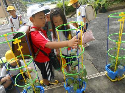 この日は、支柱からはみ出して伸びているツルに1年生の子が困っていました。すると、近くにいた3年生や2年生の子が、「こうしてまきつければいいんだよ」と教えてくれました。また、「前はこれぐらいだったけど、こんなに伸びたよ」と自分の手の大きさと比べて教えてくれる子も。昔の自分の経験を、今困っている子に伝えたり、前と今を比べてその変化に気付いたりと、「思いやり」や「探究の心」が育っています。