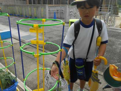 1年生が育てているアサガオがつるをぐんぐん伸ばしています。