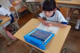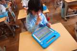 タブレットから連絡を写す3年生です。