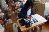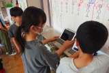 タブレットを見ながら、発表の練習をしている5年生です。