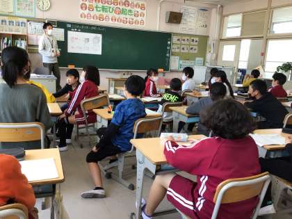 4月28日 算数 5年生 公開日 2023/04/28 更新日 2023/04/28 校長室から 5年生は「立方体や直方体の体積を求めよう」の学習をしています。 1㎥は1㎤の何倍になるのかな? 隣の席の友達と話し合いながら、考えていました。