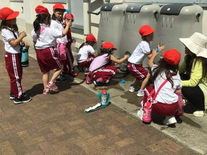 雨水タンクから水をくんで、アサガオの鉢にお水をあげました。