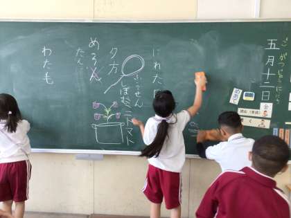 こくさいの「い」→「いす」→「すいか」→「かめ」→「め」→「メロン」でタイミングよくチャイムが鳴り終わりました。あいさつの後は、全員が黒板に行き、黒板をきれいにしてくれました。