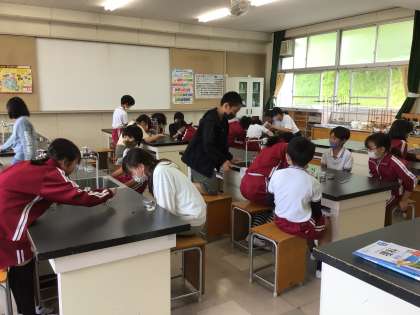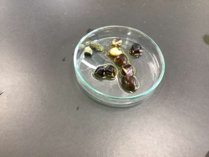 植物の発芽と成長の学習です。 インゲンマメの種をヨウ素溶液につけてみました。 さて、どうなったかな?