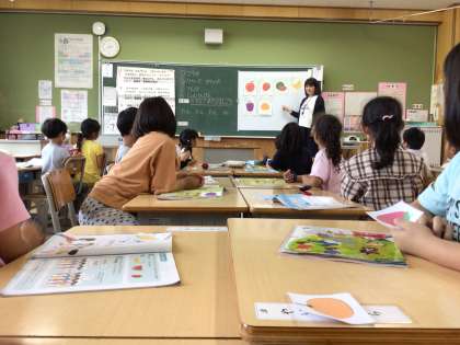 果物を見ながら「み」「か」「ん」「●」「リ」「ん」「ご」「●」とカスタネットを打ちました。
