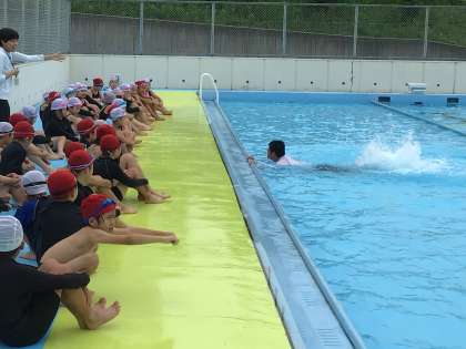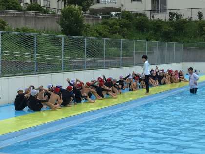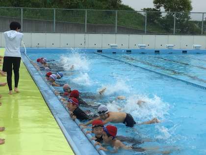 曇り空ですが、プールを楽しんでいます。 時々、「バディ!」と声を出して、相手の確認をしています。