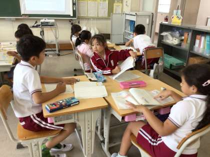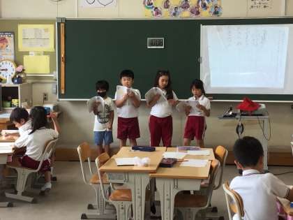 6月15日 国語 2年生 その2 公開日 2023/06/15 更新日 2023/06/15 校長室から もう一方のクラスでも、音読発表会に向けて練習をしていました。 えっちゃんの赤い帽子を見せてもらいました。 「うめだえつこ」と刺繍がしてあります。