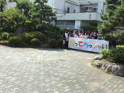 6年生の見送りの中、バスに乗り込みます。