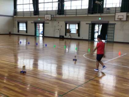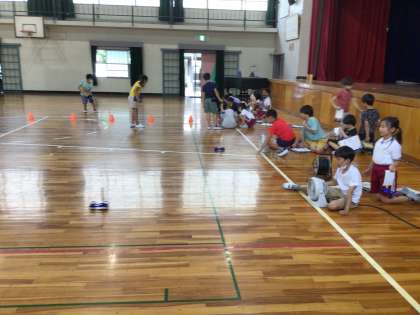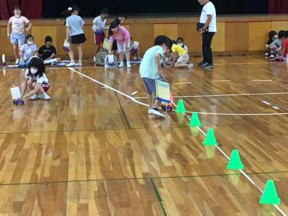 「ゴムや風の力」の風の実験です。 送風機を設置して、風の力でどれだけ車が動くか実験しました。
