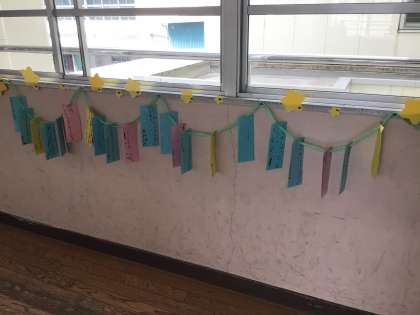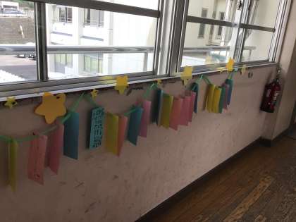 2年生の廊下には願い事が書かれた短冊が並んでいます。