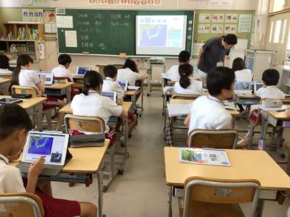 学習用タブレットを使って、天気がわかるアプリからアメダスの記録を見て判断します。