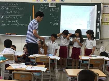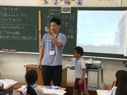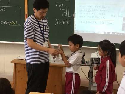 7月13日 算数 2年生 公開日 2023/07/13 更新日 2023/07/13 校長室から 先生から渡された10mLの水の入った注射器を持った子が10人。 今から実験です。 10mLが10でこのカップ(1dL)がいっぱいになるはずです。 結果は・・・。