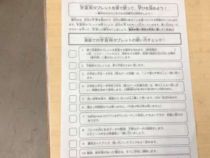 本日、A3サイズの「夏季休業中の学習用タブレットの持ち帰りについて(お願い)」、A4サイズの家庭保管用、同じくA4サイズのチェック表の3枚が配られました。