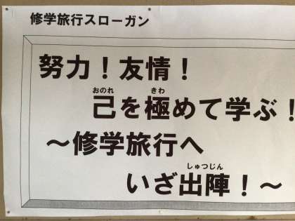 6年生の廊下に修学旅行のスローガンの掲示がありました。 「己を極めて学ぶ」深いです。