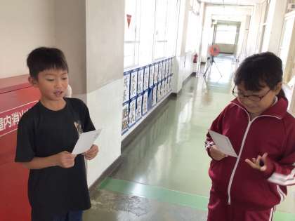 9月14日 外国語 5年生 公開日 2023/09/14 更新日 2023/09/14 校長室から 廊下で会話をしているので、見に行くと英語で会話の練習をしていました。 「今から(担任の)先生と話すんだよ」と教えてくれました。 教室をのぞくと、時間割のカードを見せてくれました。 「これを元に先生から質問されたんだよ」 すらすら英語が出てくるので、「かっこいい」と感心しました。