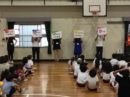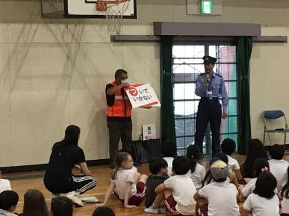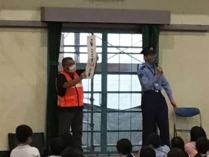 9月14日 避難訓練(不審者訓練) 公開日 2023/09/14 更新日 2023/09/14 校長室から 不審者が取り押さえられた合図で、体育館に避難しました。 警察の方から命を守るために「つみきおに」を教えてもらいました。