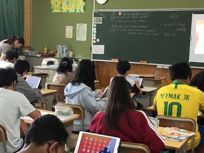 学習用タブレットの辞書や翻訳機能を使って、調べて書き込んでいました。