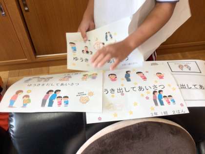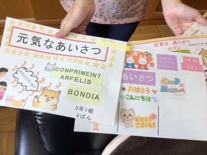 「校長先生、私たちは国語の時間にあいさつができるようにポスターを作りました。これを学校に掲示しても良いですか」