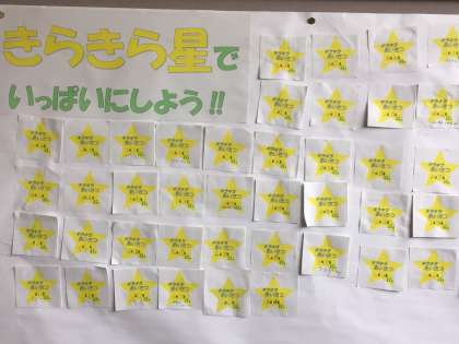 上手なあいさつをして、星のシートをもらいます。それにクラスと番号を書いて、学年の掲示板に貼ります。